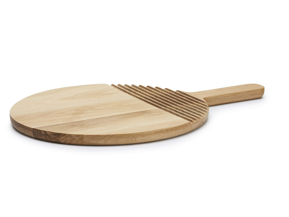 Suuri pyöreä tamminen leikkuulauta. Harkittuja yksityiskohtia. Tukeva ja hyvin käteen istuva kädensija tarjoiluun. Näyttävät ja käytännölliset urat estävät työkaluja luistamasta paikaltaan liian helposti.