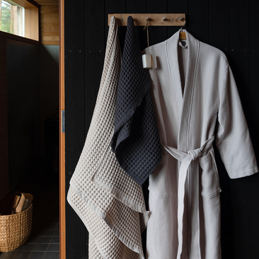 Drawing from the harsh but beautiful nature of the North, Pentik's Spa collection brings a clean and relaxing breath to the bathroom and sauna. Wrapping up in a cotton Tundra bathrobe is wonderful after a bath or sauna. The light brown bathrobe is a smaller size (S-M) and the dark gray bathrobe is a larger size (L-XL). 100% Cotton, made in Europe. A perfect gift idea for staff.