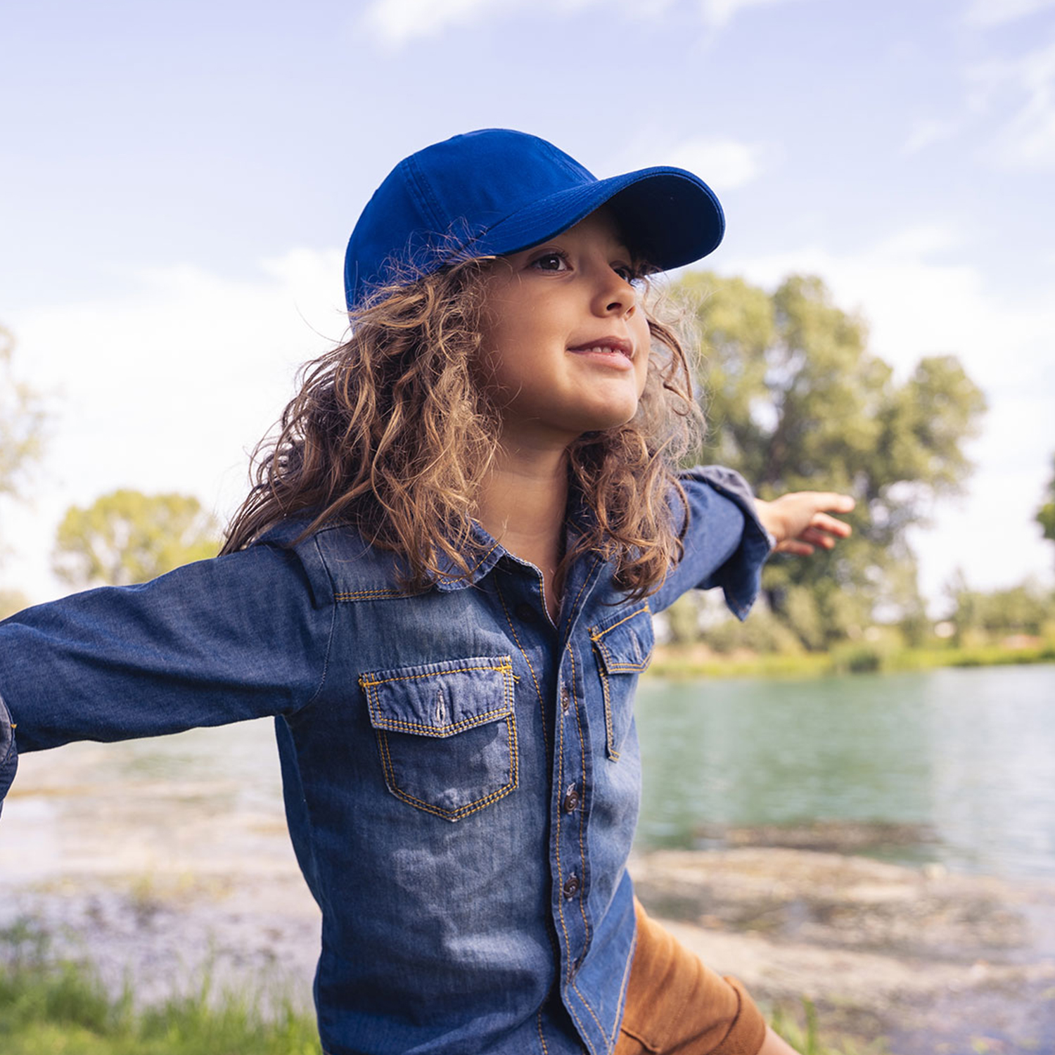 Pehmeä 6-paneelinen lippis luomupuuvillasta. Dad hat -malli, mid visor ja metallinen solki. Lasten koko 54 cm.