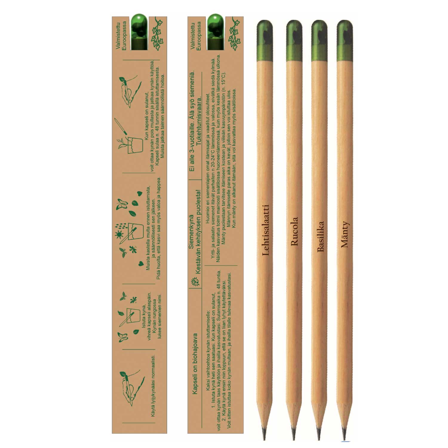 Pahvikotelossa käyttäohjeet suomeksi. Kynässä löytyy valmiina lasermerkkaus sen sisältämistä siemenistä. Huom. saatavilla myös ilman pahvipakkausta.