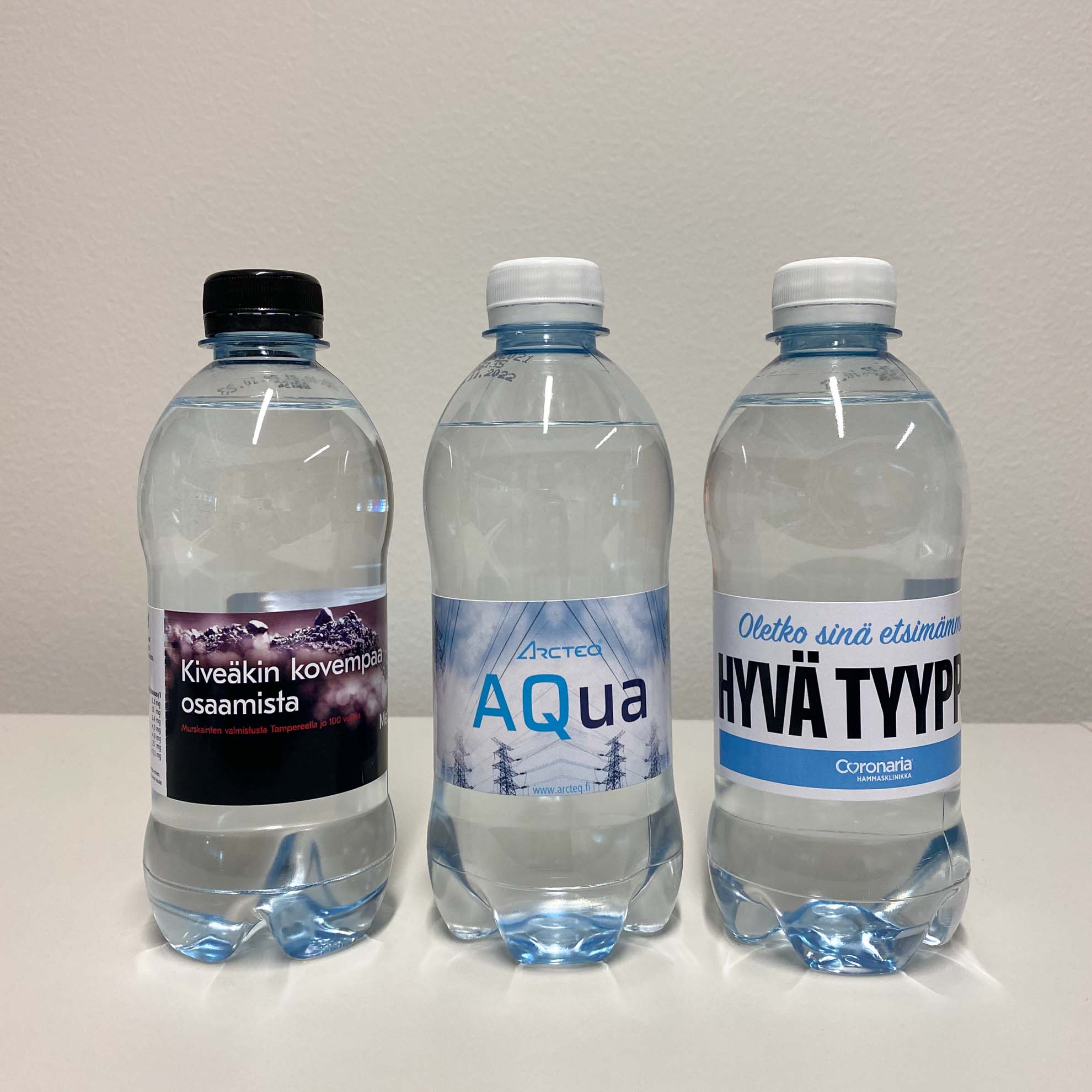 A bottle of water with its own label is becoming more and more popular at trade fairs and other events. The stylish and stable quality bottle, which is blown with so-called PET molds, is 100% recyclable through Palpa Oy's contract. The custom-designed label is 4-color photo quality and the water is from Kivistö's fountain. Normal delivery time is about 1 week, but when in a hurry, delivery is within 24 hours. Available in carbonated and still water. Cap colors black or white. A deposit will be added to the price. 0.35L bottle 0.10eur (incl. VAT)