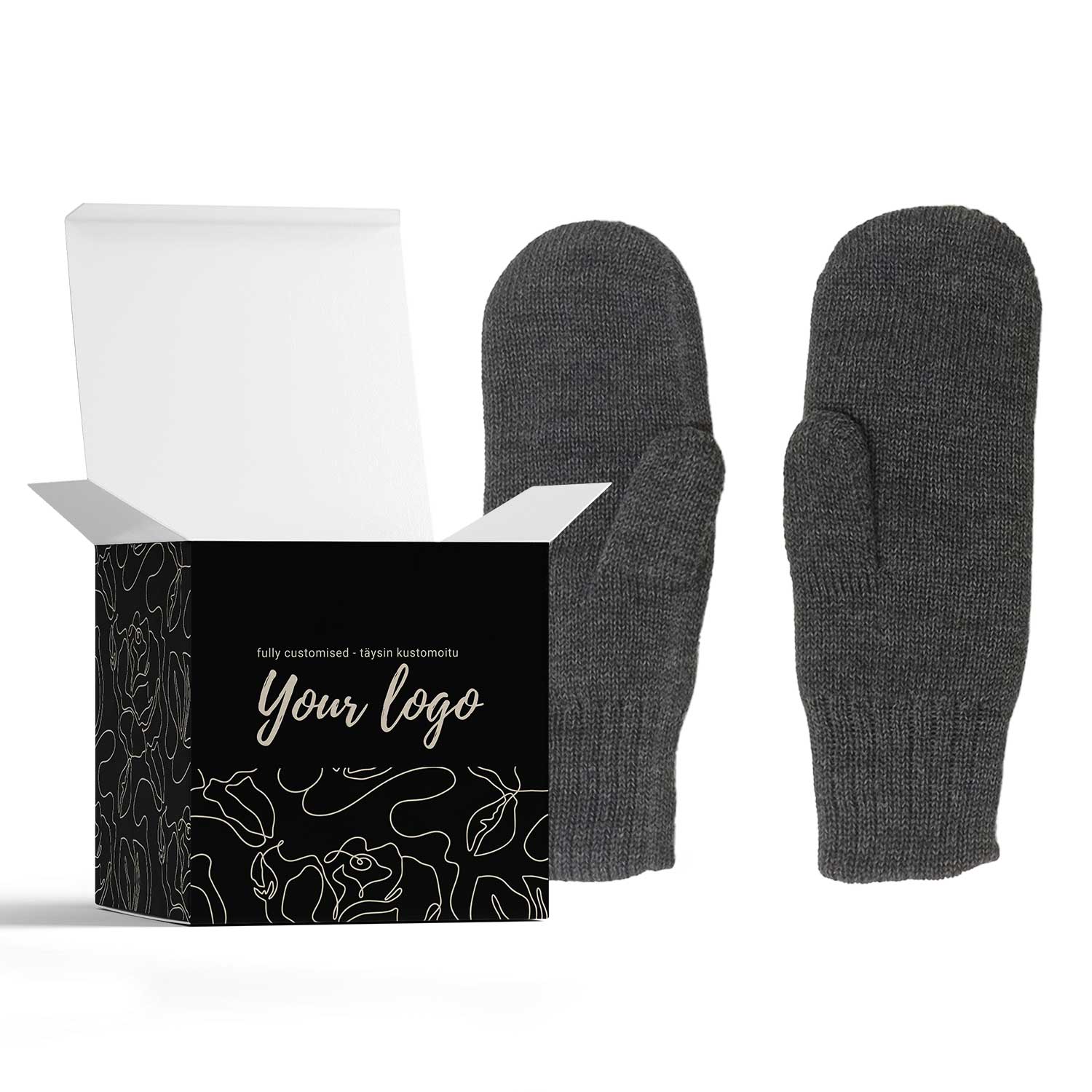 Soft and warm merino wool gloves/mittens knitted in Finland in a 10x10x10cm gift box customized with your own design. The merino wool used in the gloves is mulesing-free, Oko-tex 100 certified extrafine merino.