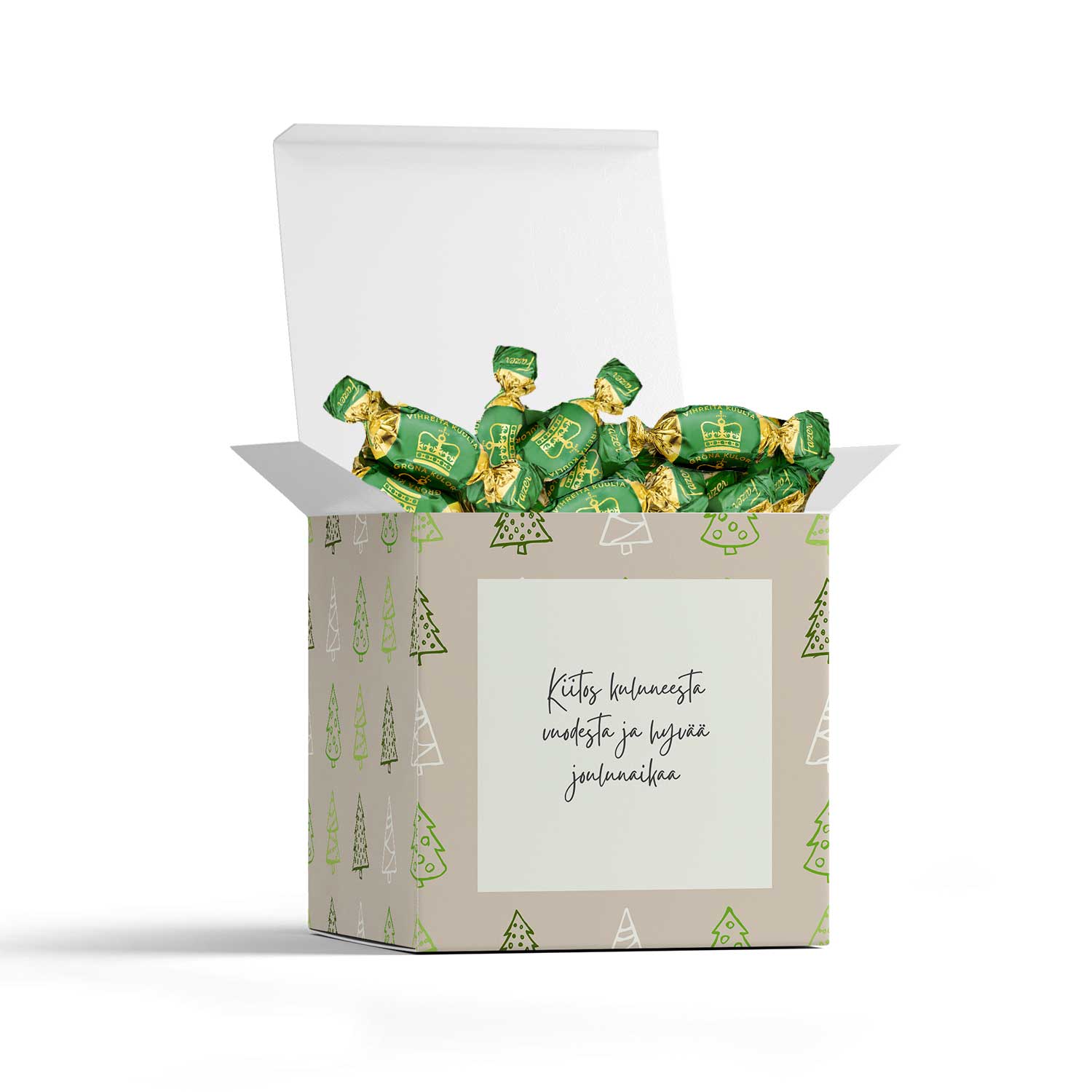 An affordable company and customer gift, for example for Christmas. A 10x10x10cm cube-shaped cardboard box completely with your own design with the delicious sweets from Fazer is a nice logo-marked gift idea. The cardboard box is made in Europe and can easily be recycled as cardboard. You can fill the box with Fazer's wrapping paper sweets of your choice. You can see an example of the flavors in the product images (Fazermint, Marianne, Geisha, Karl Fazer milk chocolate, Karl Fazer 70% dark chocolate or Vihreät kuulat candies) Ask for more about other options if you can't find a suitable one.
