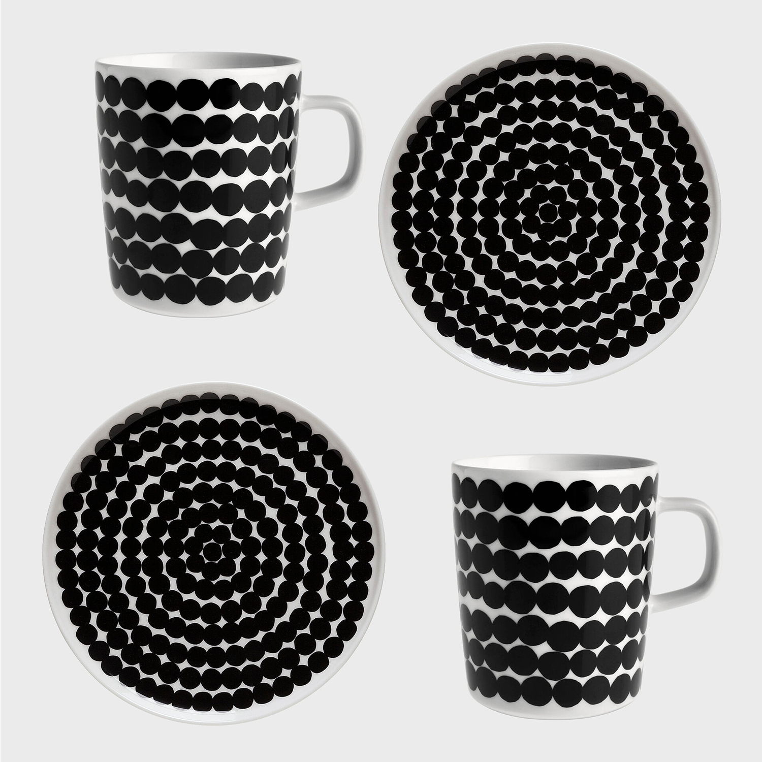 This Räsymatto breakfast set includes two Oiva mugs (2 x 2,5dl) and two Oiva plates (2 x 20cm). The dishes are made of white stoneware, which is dishwasher, oven, microwave, and freezer proof. The set is packed in a Marimekko Logo gift box. The Räsymatto (rag rug) pattern, inspired by allotment gardening, is linked to topical themes like sustainable living and the joy of working with your hands. Allotments, with their flower and vegetable beds, represent urban nature at its best, and a rag rug on the floor of an allotment cottage tells a colourful story of its own.