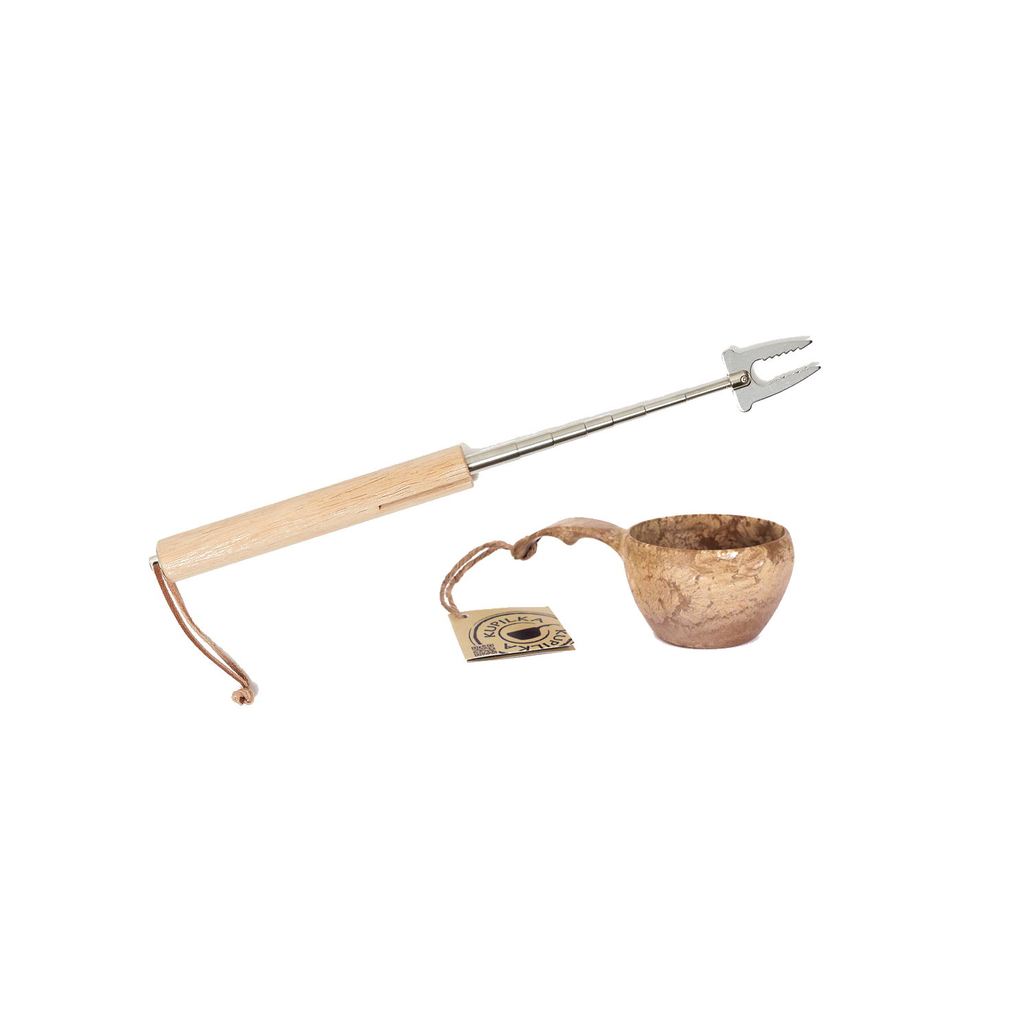 The telescopic grill stick is suitable for open flames. The ends of the fork have barbs so that the grilled does not fall off the stick. A handy leather loop makes it easy to hang and the wooden handle ensures a good grip. The set also includes ecological Kupilka drinking vessel that can withstand both boiling water and -30 ° C frost. Kupilka is made in Finland. The dish can be washed by hand in nature or in the dishwasher when you return home.