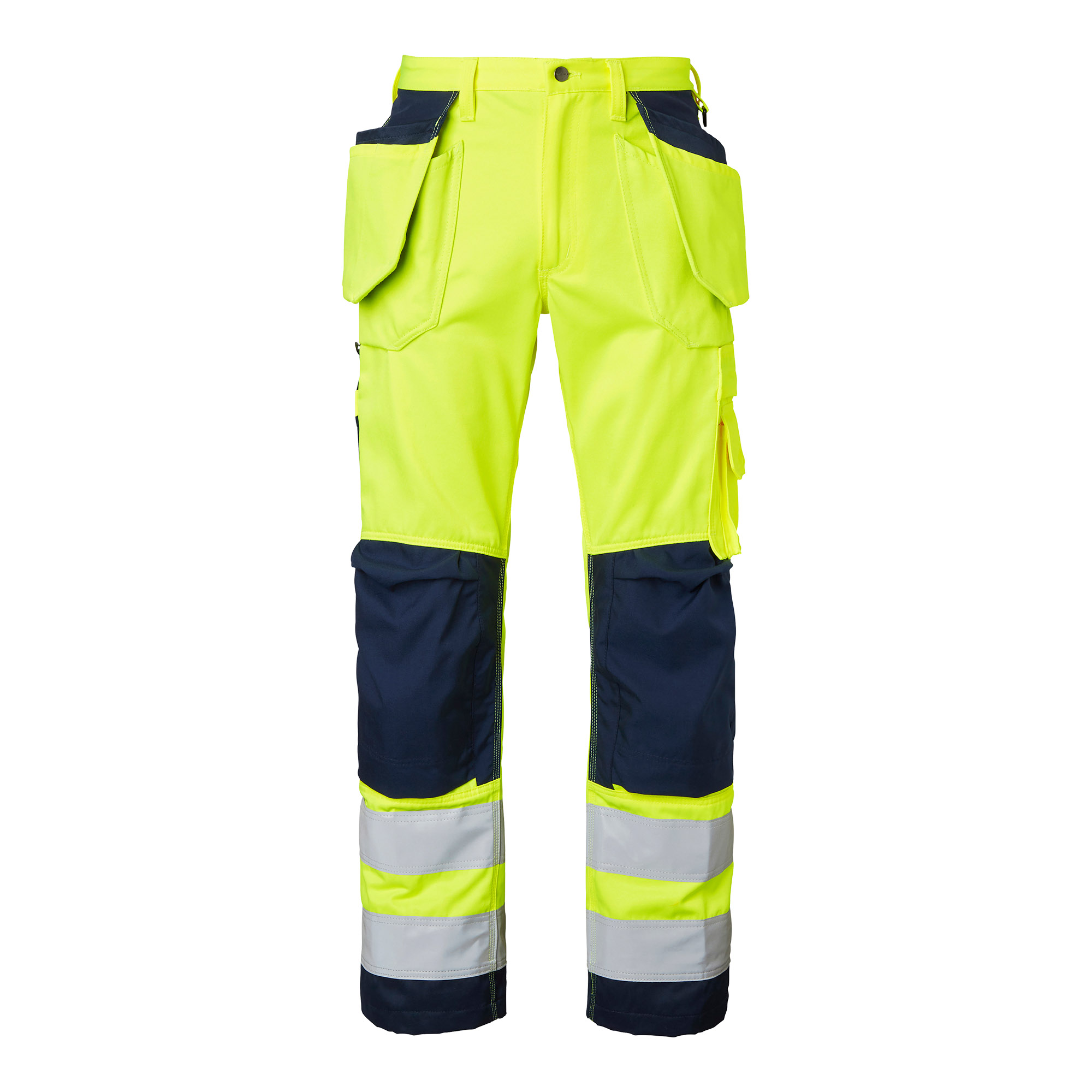 The carpenter’s trousers have articulated knees and CORDURA® knee pockets. Knee protection can be positioned at two different levels. Two front pockets and two bellowed back pockets reinforced with CORDURA®. Loose-hanging nail pockets reinforced with CORDURA®. The hanging pocket on the left has an extra compartment. The one on the right has three smaller accessory compartments and a hidden, foldable ID-card compartment. Adjustable hammer holder. Front folding rule pocket that is loose at the bottom for improved comfort. The folding rule pocket has two knife-holders, a loop and a pen compartment. Leg pocket with an enclosed zip and pen and phone compartments. D ring. EN ISO 20471 Class 2.
