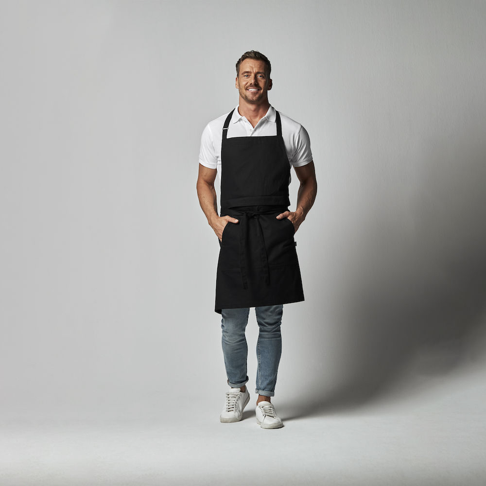Cottover esiliina, jossa on kaksi eri funktiota. Edessä kahteen osaan jaettu iso tasku. Solmittava nauha vyötäröllä. Voit käyttää essua kokopitkänä säädettävän kaulahihnan kanssa tai vyötäröesiliinana. Yläosa voidaan taittaa kätevästi alas piiloon. Koristetikkaukset sävysävyyn kankaan kanssa. Denimin värisessä kankaassa keltaiset tikkaukset. Essu on valmistettu Reilun kaupan luomupuuvillasta. Oeko-Tex -sertifioitu.