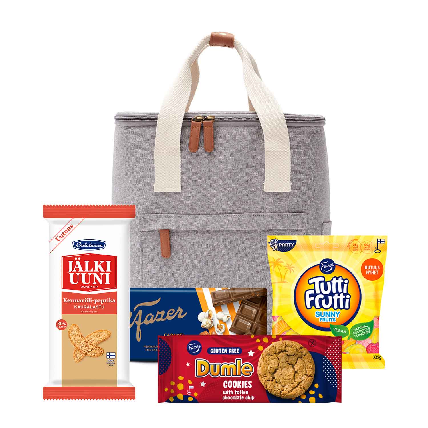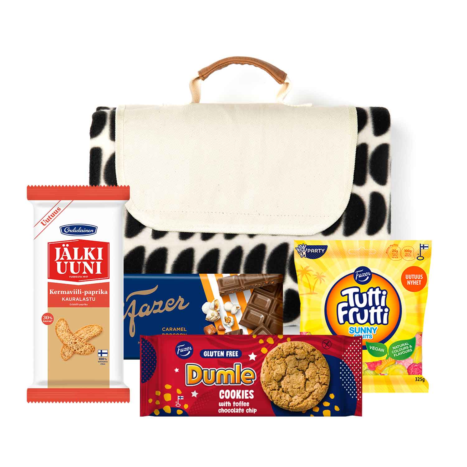 Anna lahjaksi piknikhetki. Viime vuoden suosituimpia lahjoja oli erilaiset herkkutuotteet yhdistettynä tyylikkääseen logomerkattuun kylmälaukkuun tai piknikmattoon. Kylmälaukkujen valikoima laajeni entisestään uusilla uutuuksilla ja voit aina valita mieleisen laukun ja lisätä siihen kesän uutuusherkut, mutta tässä kaksi valmista lahjaehdotusta, joissa komeilee suosituimmat tuotteet piknikvalikoimasta.