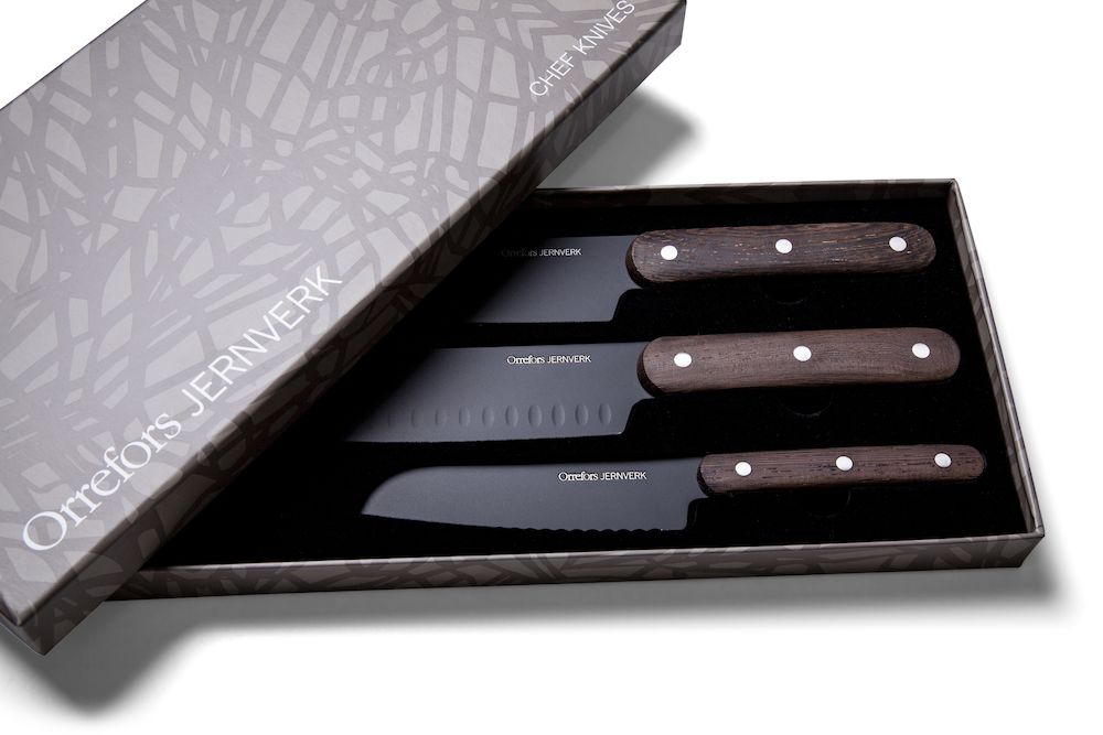 Orreforsin uusissa veitsissä on ainutlaatuinen muotoilu. Veitsissä on tummat veitsenterät ja kevyet puukahvat. Pakkauksessa on tomaattiveitsi, japanilainen kokkiveitsi ja kokkiveitsi. Nämä veitset kestävät vuosia. Materiaali: terämateriaali terästä, kahva Wenge-puuta. Koko: terän pituus - tomaattiveitsi 12cm, japanilainen veitsi 18cm ja kokkiveitsi 20cm.