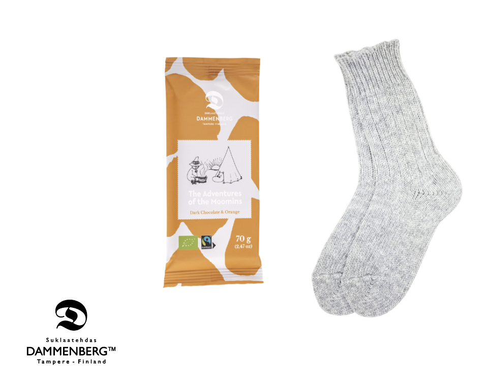 Kestävät Suomessa mulesointivapaasta karstavillalangasta neulotut lämpimät perinteiset villasukat yhdistettynä Dammenbergin luomu Muumi -suklaalevyyn, on ihana lahjaidea yrityksesi sidosryhmille. Suklaa on pähkinätön, gluteeniton, kananmunaton, maidoton ja laktoositon.
