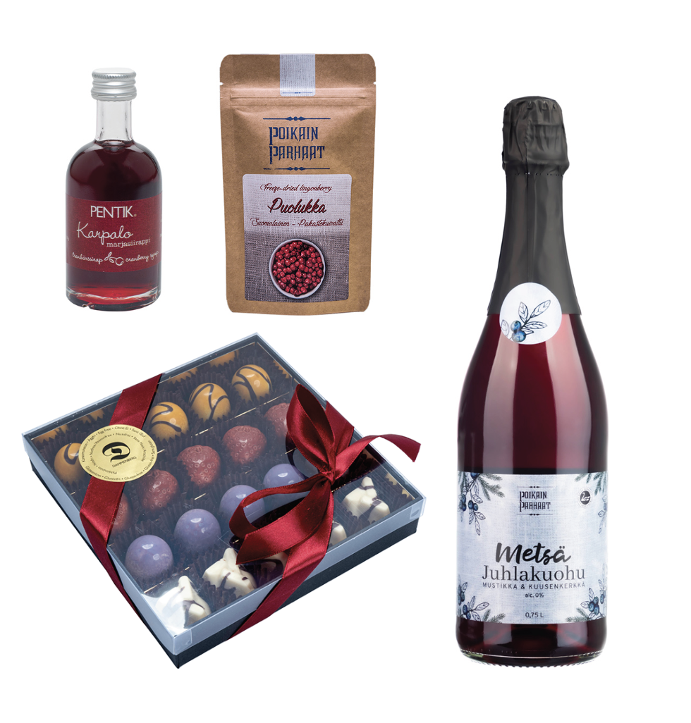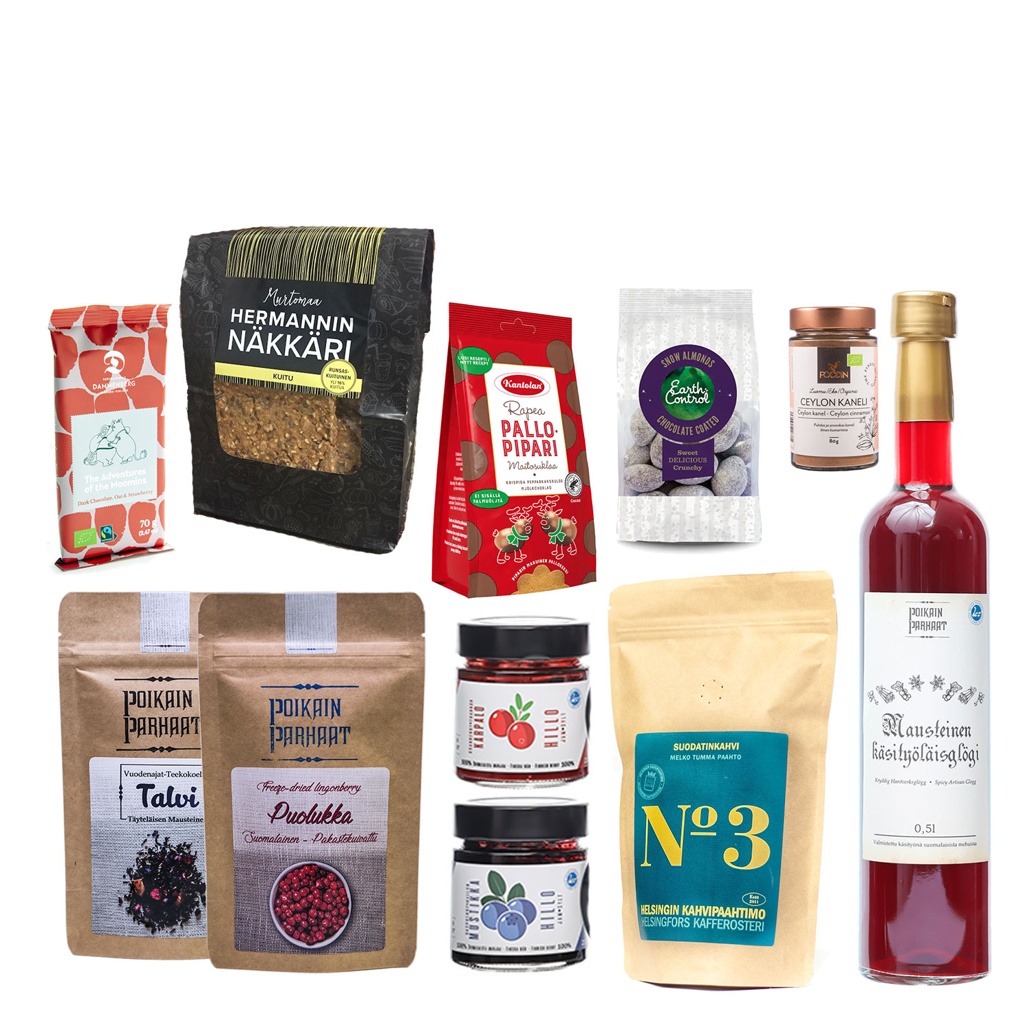 Joulun 2021 uutuus herkkukori on täynnä kotimaisia herkkuja jokaiseen makuun. Herkkukorista löytyy Poikain Parhaat kotimaisia hilloja, glögiä, teetä ja pakastekuivattuja puolukoita Suomen luonnosta. Poikain Parhaat -tuotteet eivät sisällä lainkaan teollisia maku- tai väriaineita ja ne ovat laktoosittomia, gluteenittomia ja vegaanisia. Kahvin tuoksua pakettiin tuo Helsingin Kahvipaahtimon herkullinen ja aromikas suodatinkahvi. Rapeutta herkkukoriin lisää Kantolan hauskat maitosuklaalla kuorrutetut pallopiparit, supermaukkaat lumimantelit sekä Hermannin näkkärin Suomessa valmistettu artesaaninäkkileipä. Herkkusuille setistä löytyy vielä Dammenbergin suklaatehtaan Suomessa käsin valmistettu laatusuklaa, jota koristaa suloinen Muumi -kuvio. Dammenbergin Muumi -suklaa on myös luomu- ja reilun kaupan tuote, pähkinätön, gluteeniton, kananmunaton, maidoton, laktoositon, vegaani, soijaton, GMO vapaa, Kosher Parve, Halal.