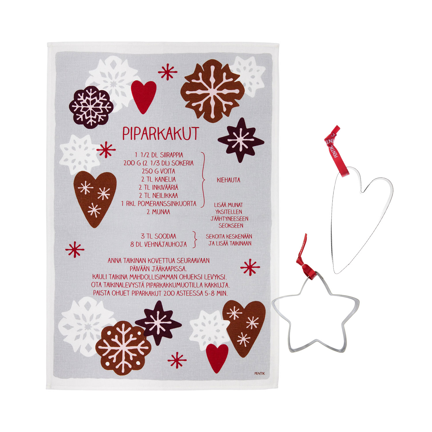 Hauska lahjaidea jouluun, joka kannustaa yhteiseen tekemiseen. Pentikin kauniissa piparkakkusetissä yhdistyy kestävä jouluinen keittiöpyyhe, josta löydät kätevästi myös piparkakkutaikinan herkullisen ohjeen sekä suloiset piparkakkumuotit. VINKKI: Lahja kulkee helposti myös kirjepostina suoraan lahjansaajalle.