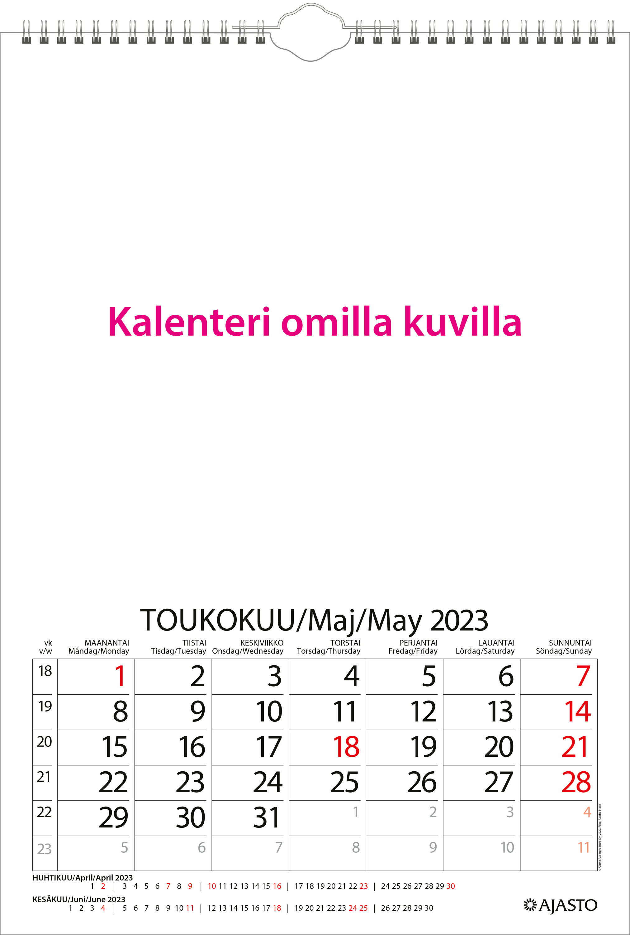 Kansi + 12 kalenterilehteä asiakkaan omilla kuvilla. Halutessa takana jatkettu taustakartonki, johon mahdollisuus painaa toiminimipainatus. Kalenterin koko 290x415 mm, jatketun taustan koko 290x465 mm. Paperi kansi 200g ja sisus 150g GalerieSilk. Värisyys 4/0, ripustinkoukku. Kartonki 300g 2-puol.kartonki.