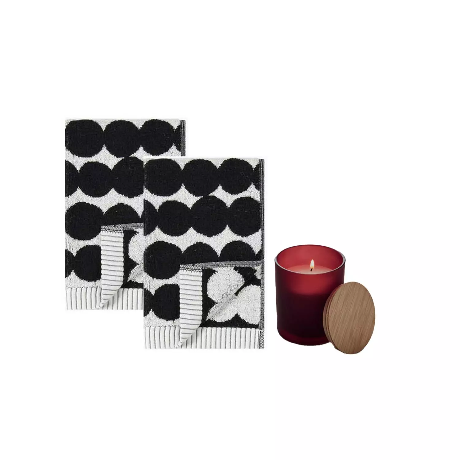 Joulun luksuslahjasetti on tyylikäs ja harkittu valinta yrityslahjaksi. Setin mustavalkoinen värimaailma on ajaton ja sopii monenlaiseen makuun. Lahjapaketista löytyy kaksi Marimekon Räsymatto-kuvioista vieraspyyhettä, jotka on valmistettu pehmeästä ja laadukkaasta luomupuuvillafroteesta. Pyyhkeet on suunniteltu Suomessa ja valmistettu Portugalissa. Setin kruunaa 120 gramman tuoksuvahakynttilä huurretussa lasiastiassa bambukannella. Kynttilä palaa jopa 20 tuntia ja sen rauhoittava tuoksu luo kotiin kylpylämäisen tunnelman. Kauniisti pakattu lahja on valmis annettavaksi ja tuo saajalleen hetken hengähdyksen joulun kiireiden keskellä. Tämä on lahja, jolla on merkitystä.