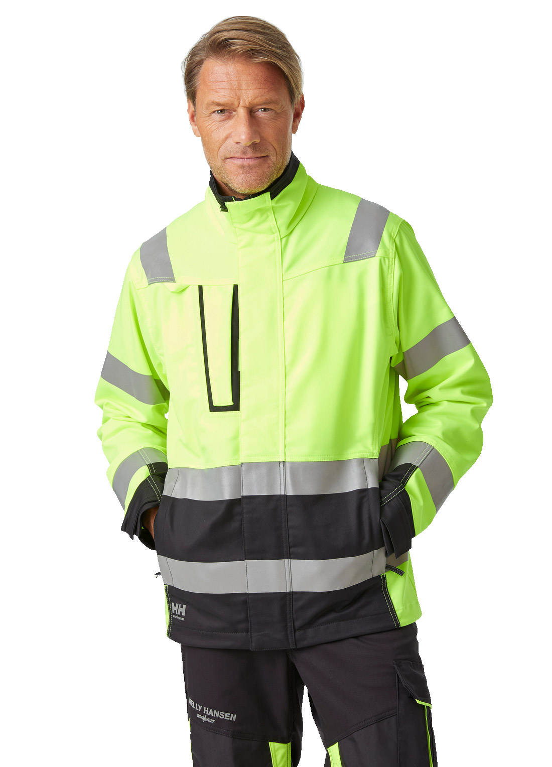 Alna 2.0 -takissa on kaksi etutaskua sekä kaksi rintataskua YKK -vetoketjuilla. Joustava kangas ja painetut heijastimet, joten se varmistaa turvallisuuden ja näkyvyyden töissä.