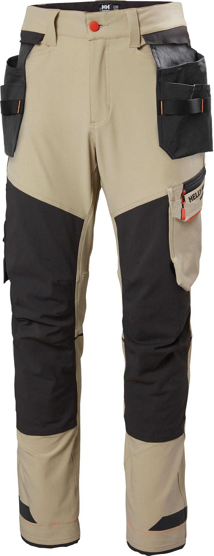 Kensington -riipputaskuhousut. Housujen päämateriaali on erittäin kestävää, ja joustavat neljään suuntaan, joten ne ovat erinomaisen mukavat. Neljään suuntaan joustava kangas ja joustavat Cordura®-vahvikkeet antavat housuille modernin ja linjakkaan ilmeen. Heijastavat raidat polvitaipeissa ja lahkeissa. Työhousuissa on irrotettavat riipputaskut.