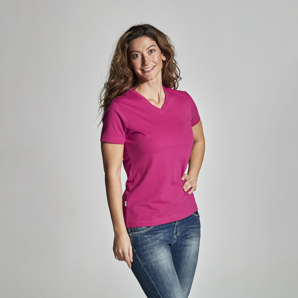 V-aukkoinen t-paita naisten mallina. Kavennettu malli, jossa pääntiellä siisti ribbineulos. Valmistettu hienolaatuisesta Reilun kaupan luomupuuvillasta. Värit: valkoinen 100, l.valkoinen 105, keltainen 255, oranssi 290, vaaleanpunainen 425, cerise 435, punainen 460, vihreä 645, taivaansininen 725, royal 767, navy 855, violetti 885, antrasiitti 980, musta 990
