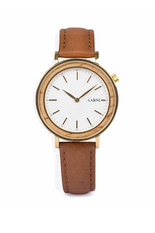Siroa ja eleganttia arvokkuutta. Aarni Aurora on klassista designia arvostavan naisen valinta. Kultaiset yksityiskohdat ja valkoinen kellotaulu täydentyvät visakoivuisella kehyksellä. Herkän muotokielen viimeistelee kotimaisesta hirvennahasta valmistettu ranneke.