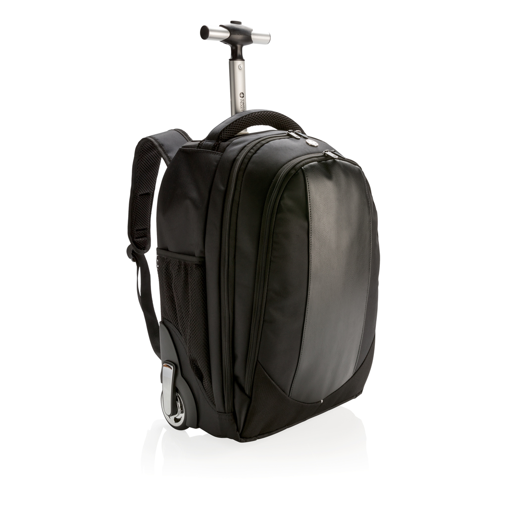 1680D selkäreppu, nailonia, ulosvedettävä alumiininen vetokahva. Pääosiossa erillinen pussi 15,6” kannettavalle tietokoneelle. Edessä järjestelytasku, vetoketjullinen. Etupuolella metallinen merkkilaatta, jossa Swiss Peak -logo. Rekisteröity designtuote®