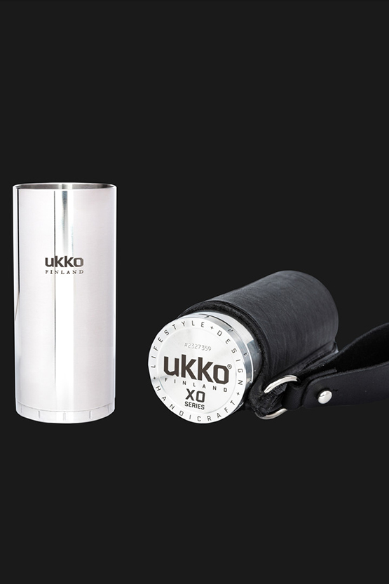 Tuttua Ukko -designia pidemmälle hiottuna. Myös nahkatuppea on kehitetty, nyt voit napata Ukkomukin vyöltä käteesi avaamalla tupen lenkin. Ukkomuki on yhdistelmä huipputason koneistusta ja pohjalaista käsityötä. Nahkatuppi suojaa kättäsi kuumuudelta ja pitää kahvisi lämpimänä pitkään.